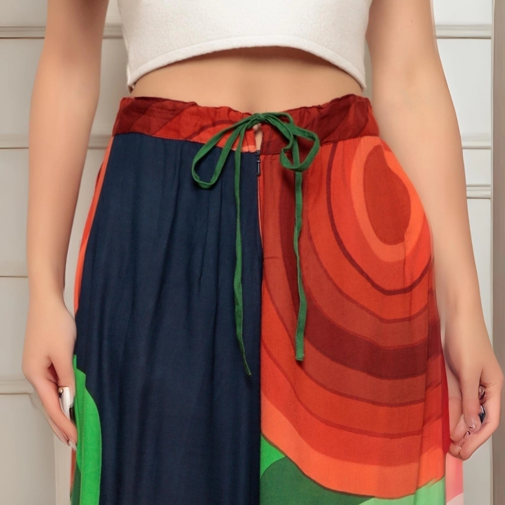A estampa vibrante e intrincada é uma homenagem à rica herança artística da Índia, enquanto o corte pantalona proporciona um caimento fluido e gracioso, destacando sua feminilidade de maneira única.